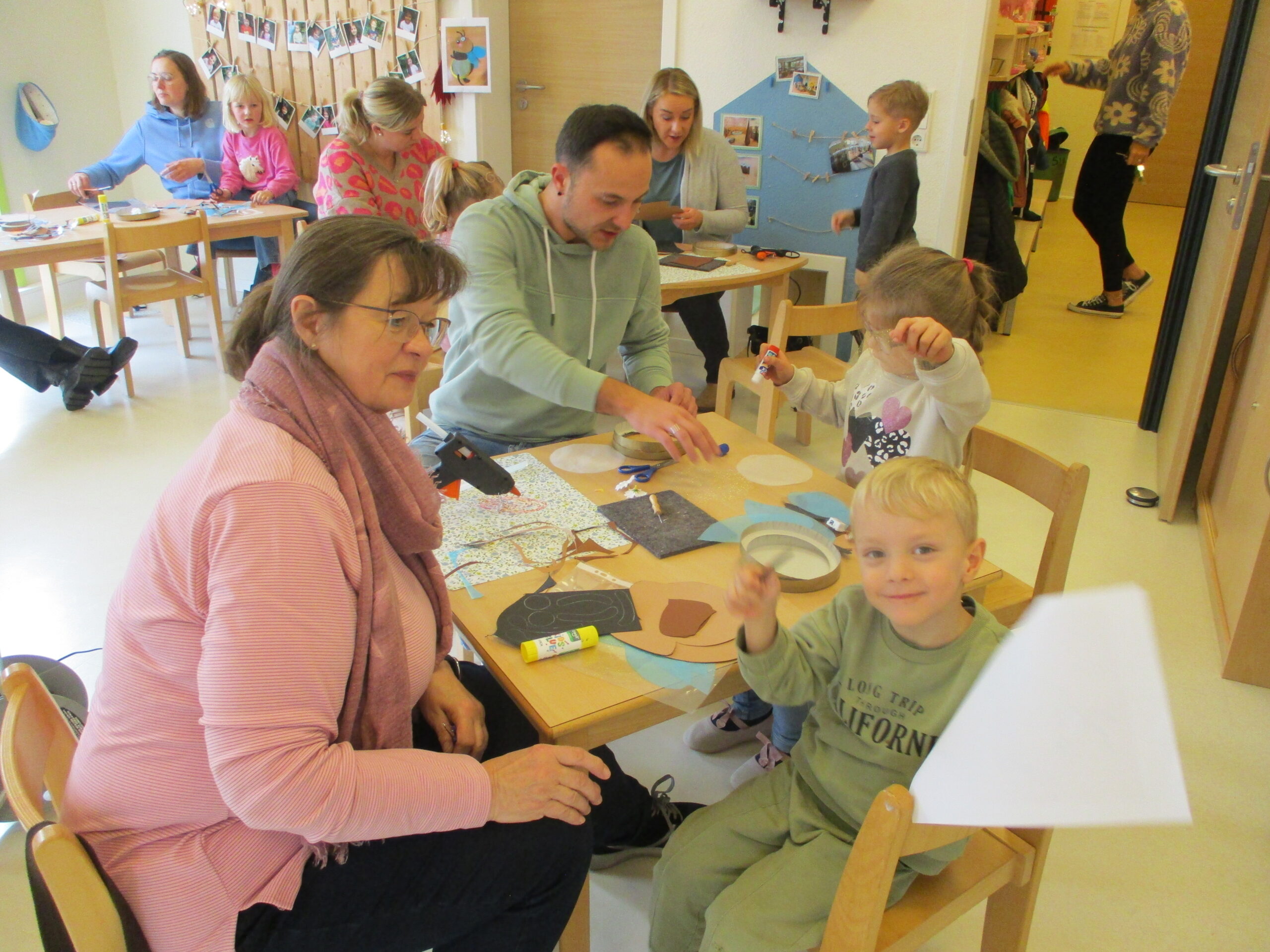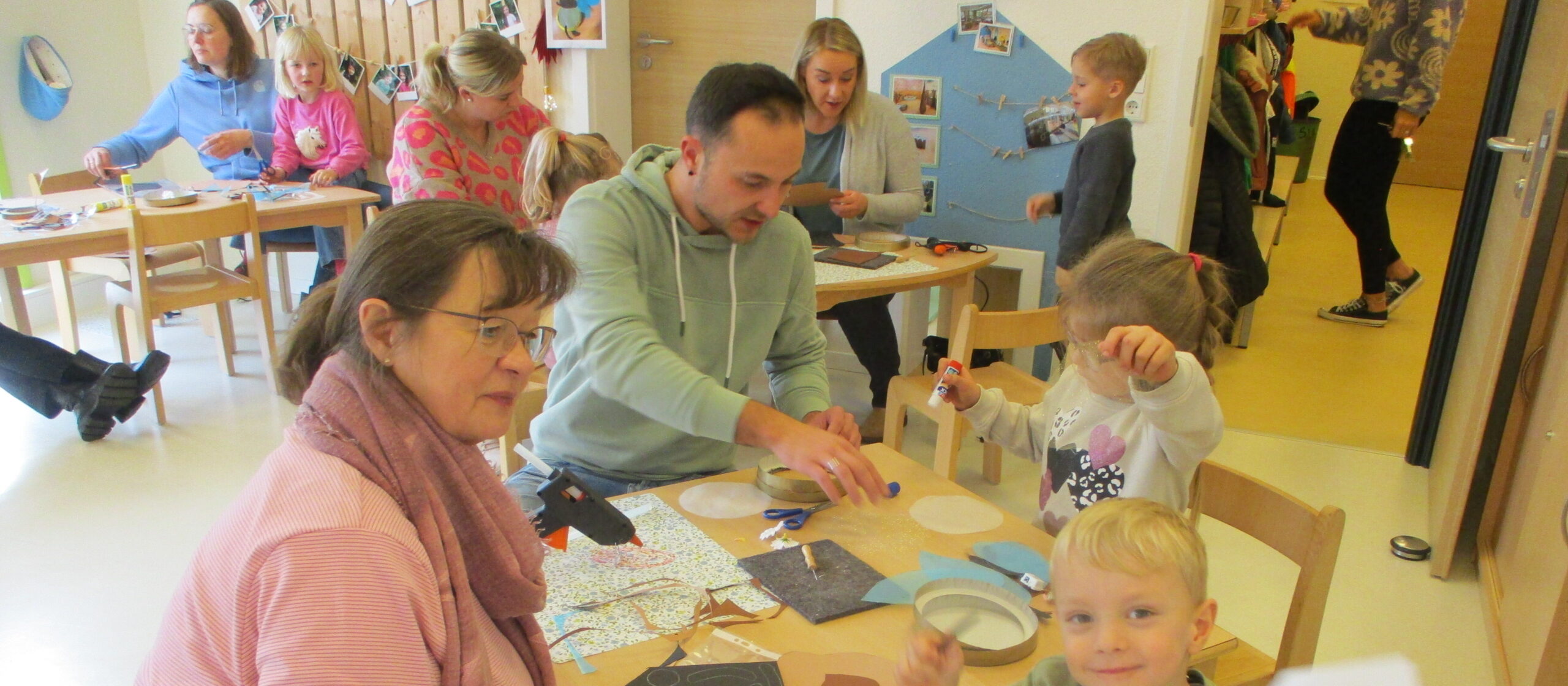 Das Laternenbasteln ist ein langjähriges Angebot, welches wir unseren Familien gern zur Verfügung stellen. Im Rahmen eines Bastelnachmittags sind Eltern, Großeltern oder Verwandte der Familie herzlich eingeladen mit ihrem Kindergartenkind eine Laterne für unseren jährlichen Martinsumzug zu basteln. In diesem Jahr stand das Glühwürmchen (groß & klein) und eine bunte Gummibärchentüte zur Verfügung. An drei Nachmittagen gab es dann Bastelspaß und am Ende sind wunderschöne Laternen entstanden, die unseren Martinsumzug erstrahlen werden.
