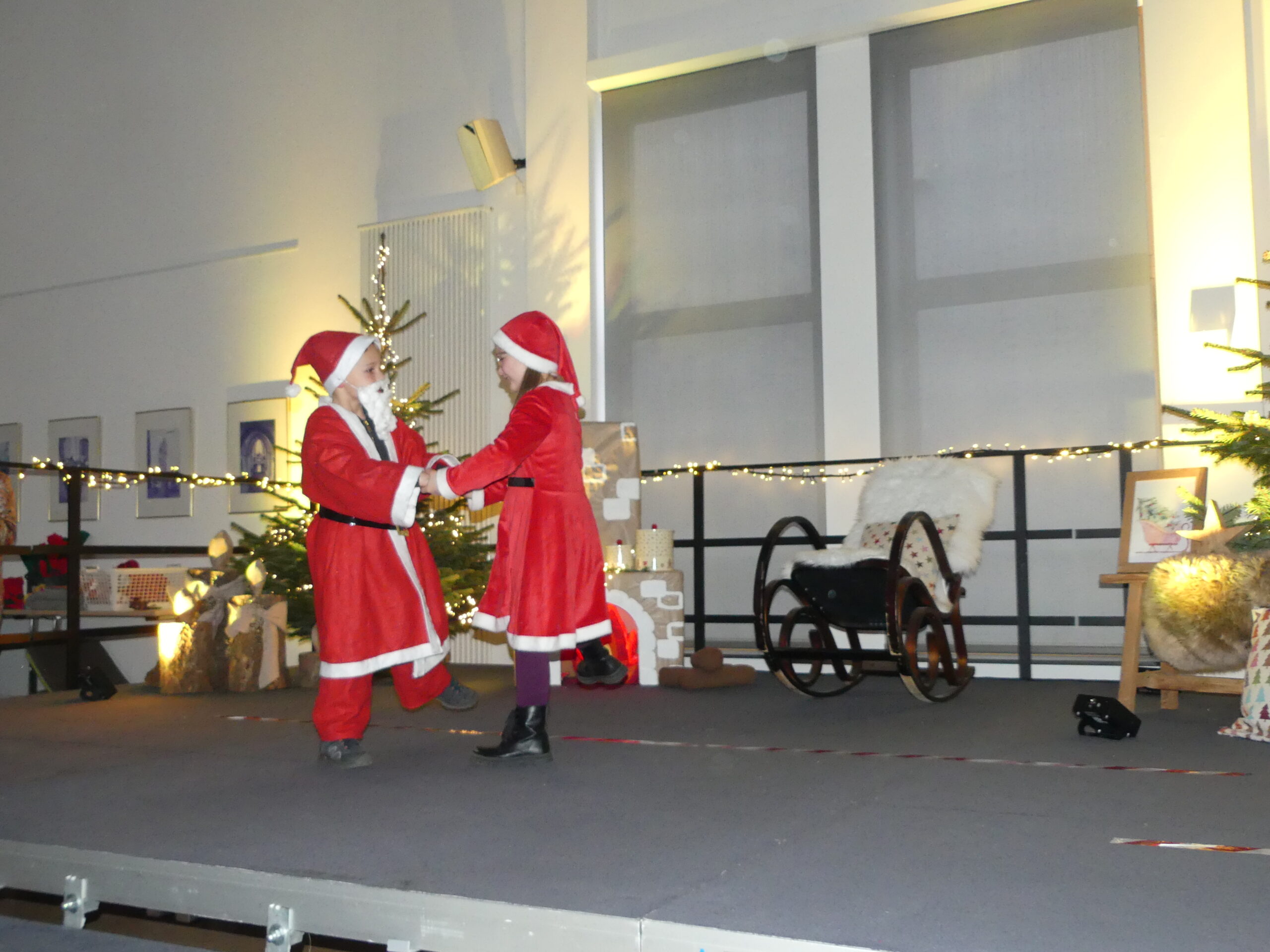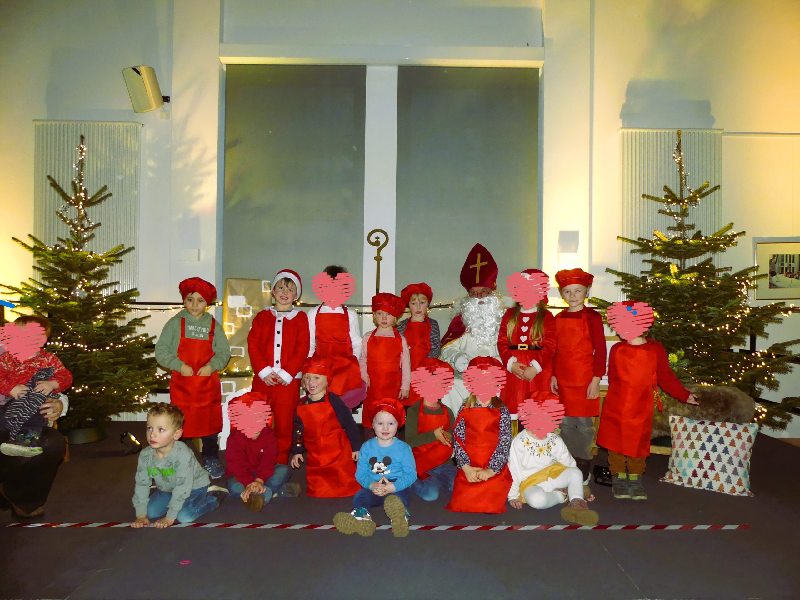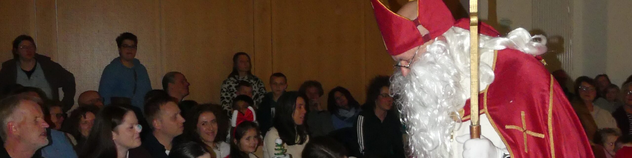 Eine fröhliche Nikolausfeier erlebten die Familien unserer Kita am 5.Dezember im Petrussaal des Pfarrzentrums. Nach der Begrüßung starten alle gemeinsam mit einem Aufwärmlied „Wir sind die Sternenfänger“, danach führten uns „Nikolaus“ und „Nikoletta“ (Felix & Liyah) durch das Programm. Nach einem kleinen Tänzchen der beiden trat der Nikolaus auf, der es sich im Schaukelstuhl bequem machte und allen drei Gruppen bei ihren eingeübten Tänzen zusah. Es scheint nicht nur ihm gut gefallen zu haben, die Kinder haben viel Applaus bekommen! Die Elefanten beeindruckten mit ihrem Kekslied, die Löwen sorgten für Bewegung mit ihrer Weihnachtspolka und die Pinguingruppe ließ die Wichtel so richtig in Schwung kommen. Für jedes Kind hatte der Nikolaus einen befüllten Socken dabei und die Geschwisterkinder gingen natürlich auch nicht leer aus.