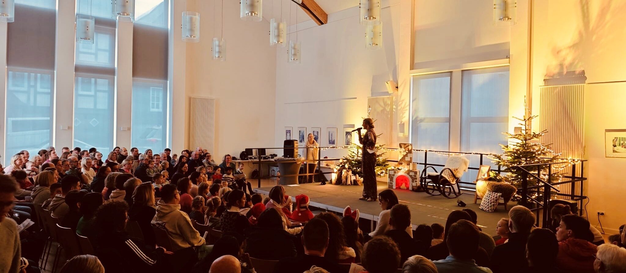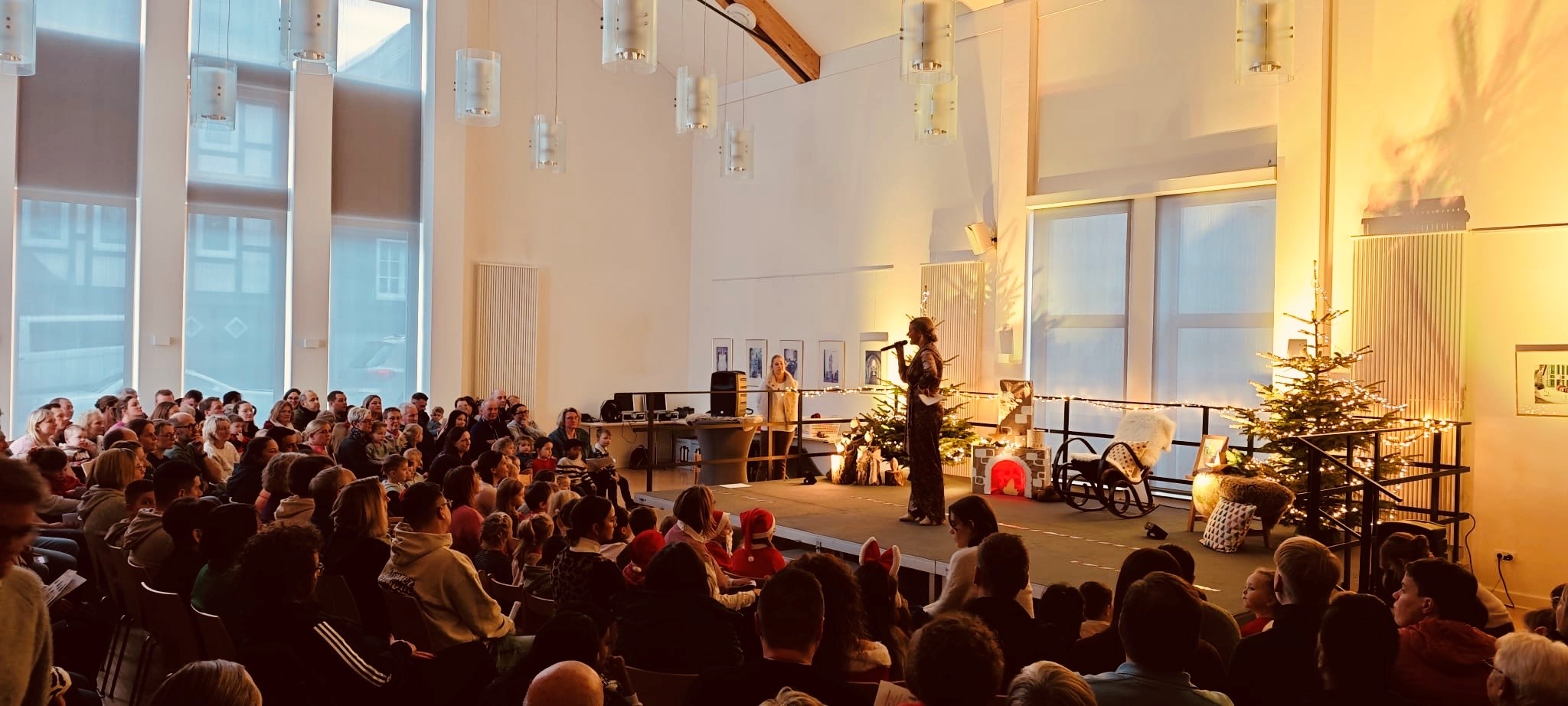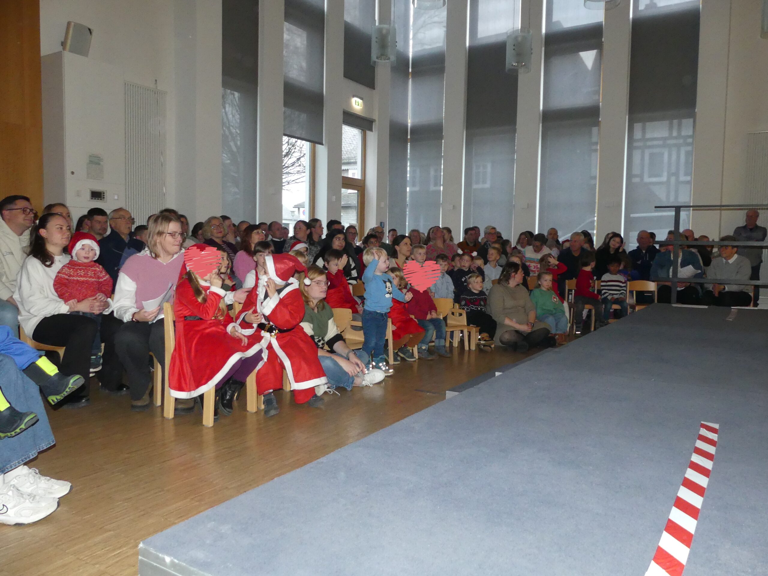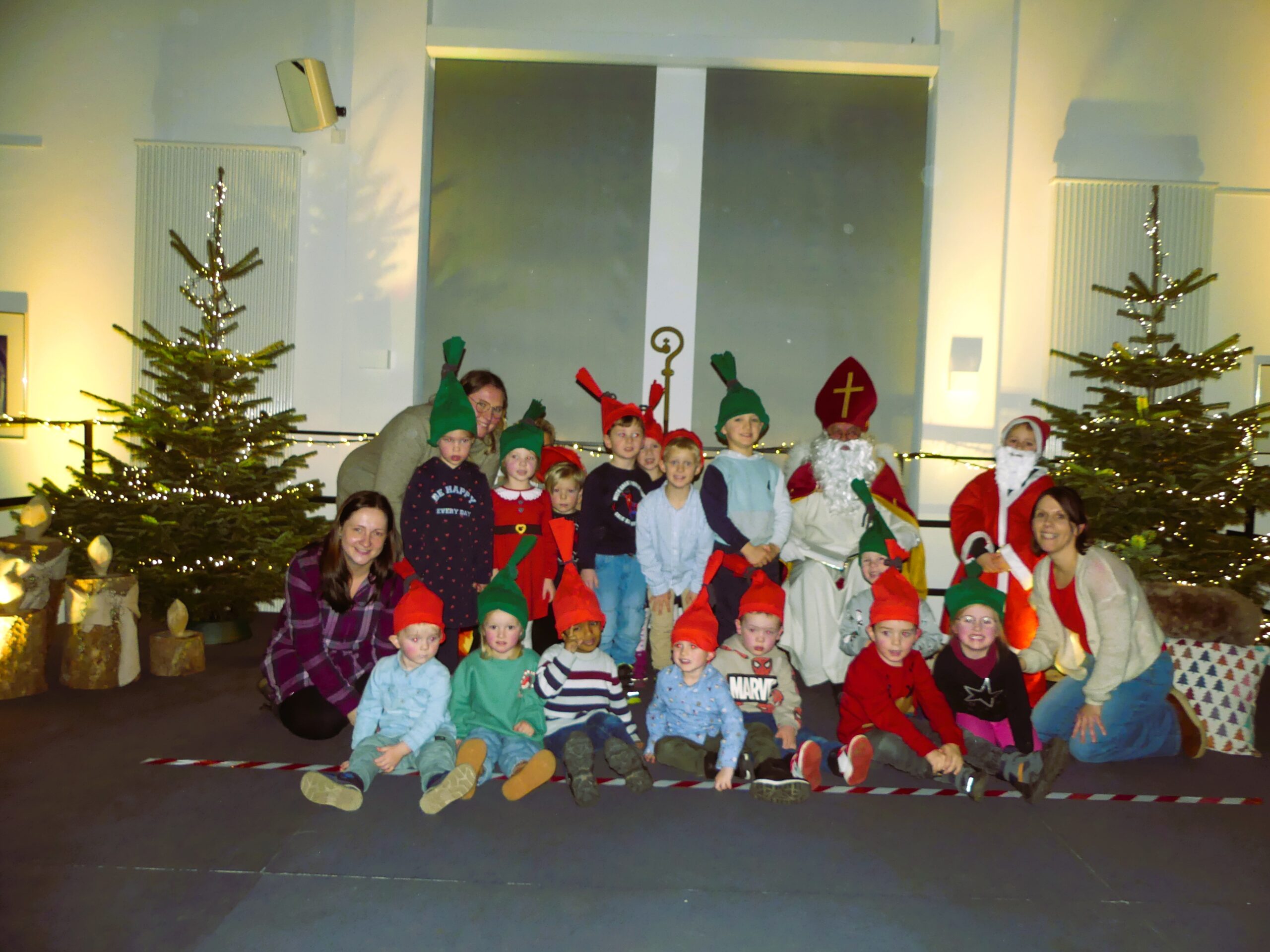 Eine fröhliche Nikolausfeier erlebten die Familien unserer Kita am 5.Dezember im Petrussaal des Pfarrzentrums. Nach der Begrüßung starten alle gemeinsam mit einem Aufwärmlied „Wir sind die Sternenfänger“, danach führten uns „Nikolaus“ und „Nikoletta“ (Felix & Liyah) durch das Programm. Nach einem kleinen Tänzchen der beiden trat der Nikolaus auf, der es sich im Schaukelstuhl bequem machte und allen drei Gruppen bei ihren eingeübten Tänzen zusah. Es scheint nicht nur ihm gut gefallen zu haben, die Kinder haben viel Applaus bekommen! Die Elefanten beeindruckten mit ihrem Kekslied, die Löwen sorgten für Bewegung mit ihrer Weihnachtspolka und die Pinguingruppe ließ die Wichtel so richtig in Schwung kommen. Für jedes Kind hatte der Nikolaus einen befüllten Socken dabei und die Geschwisterkinder gingen natürlich auch nicht leer aus.